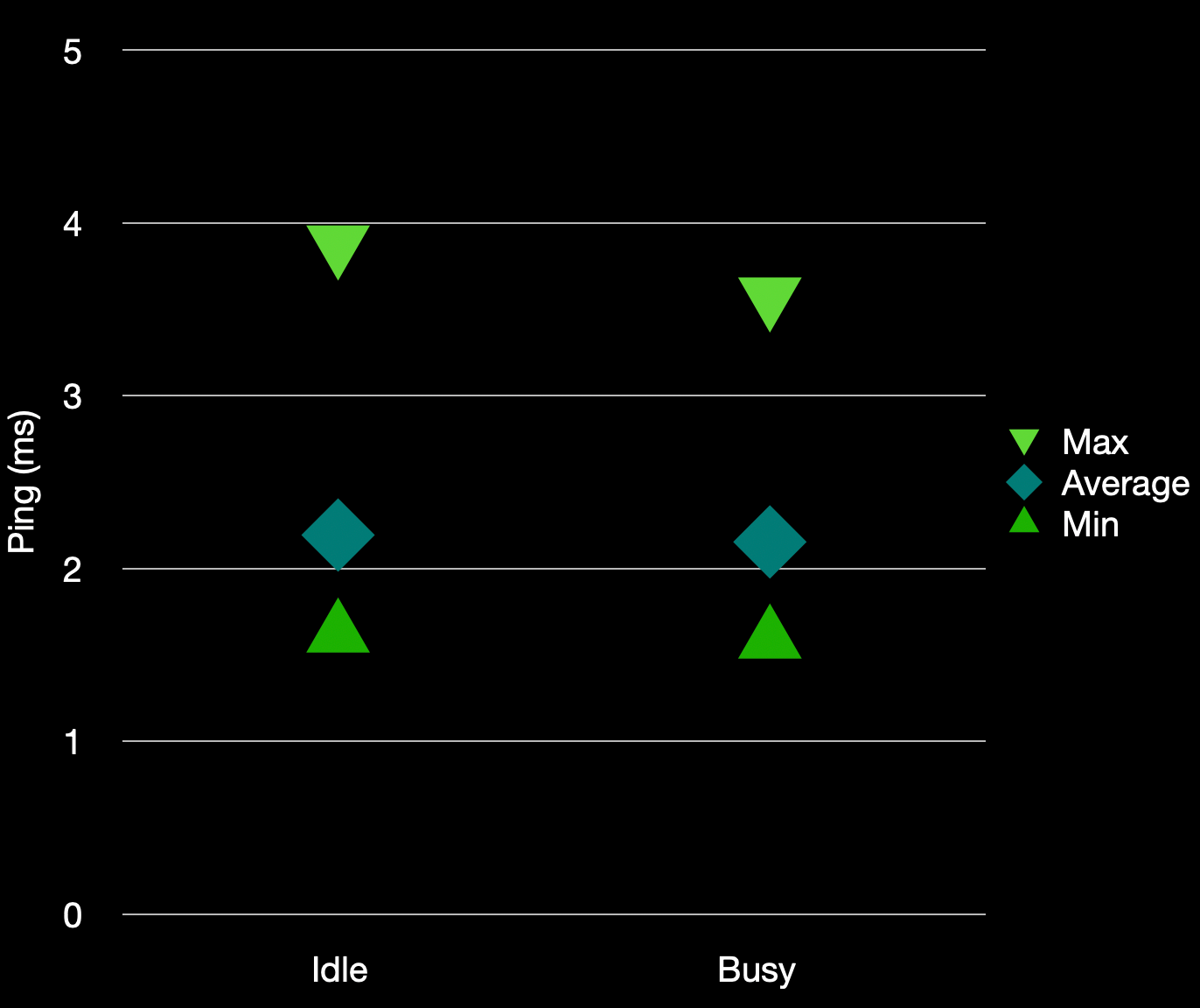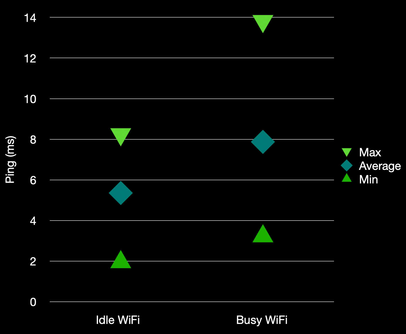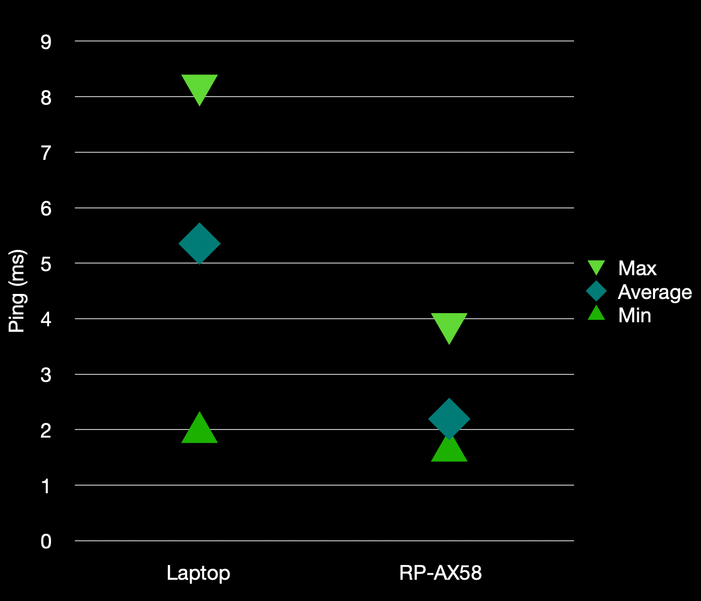 Since everything goes through the switch, the RP-AX58 can be the only WiFi client so there’s no competing for wireless bandwidth. Even when one device is downloading a file at the full 1Gbps from the internet, pings stay great: